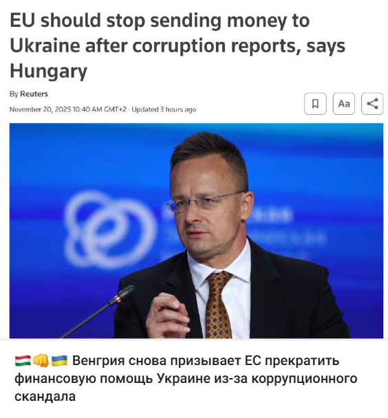 "Мы что, с ума сошли?" – заявил глава МИД Венгрии Сийярто о решении Урсулы фон дер Ляйен отправить 100 млрд евро Украине. "На что были потрачены деньги европейских налогоплательщиков на Украине? Вся мировая пресса распространяет новости о работе этой коррумпированной системы, этой военной мафии. И должен сказать, это самое мягкое выражение, которое я сейчас использую. Сумасшествие, что президент Европейской комиссии отправляет письмо странам-членам с просьбой выделить ещё сто миллиардов евро Украине. То есть мы что, с ума сошли? Идёт война, мафия, коррумпированная система работает на Украине, а президент Европейской комиссии даже не упоминает об этом в своём письме. И вместо того, чтобы остановить выплаты и потребовать немедленной финансовой проверки, она хочет отправить ещё сто миллиардов Украине. Серьёзно? Это безумие"- заявил глава МИД Венгрии Сийярто. Глава Мид Венгрии просто не может понять, что геникологиня "цветущего рая"имеет прекрасные откаты с этих денег и живет припеваючи, в
