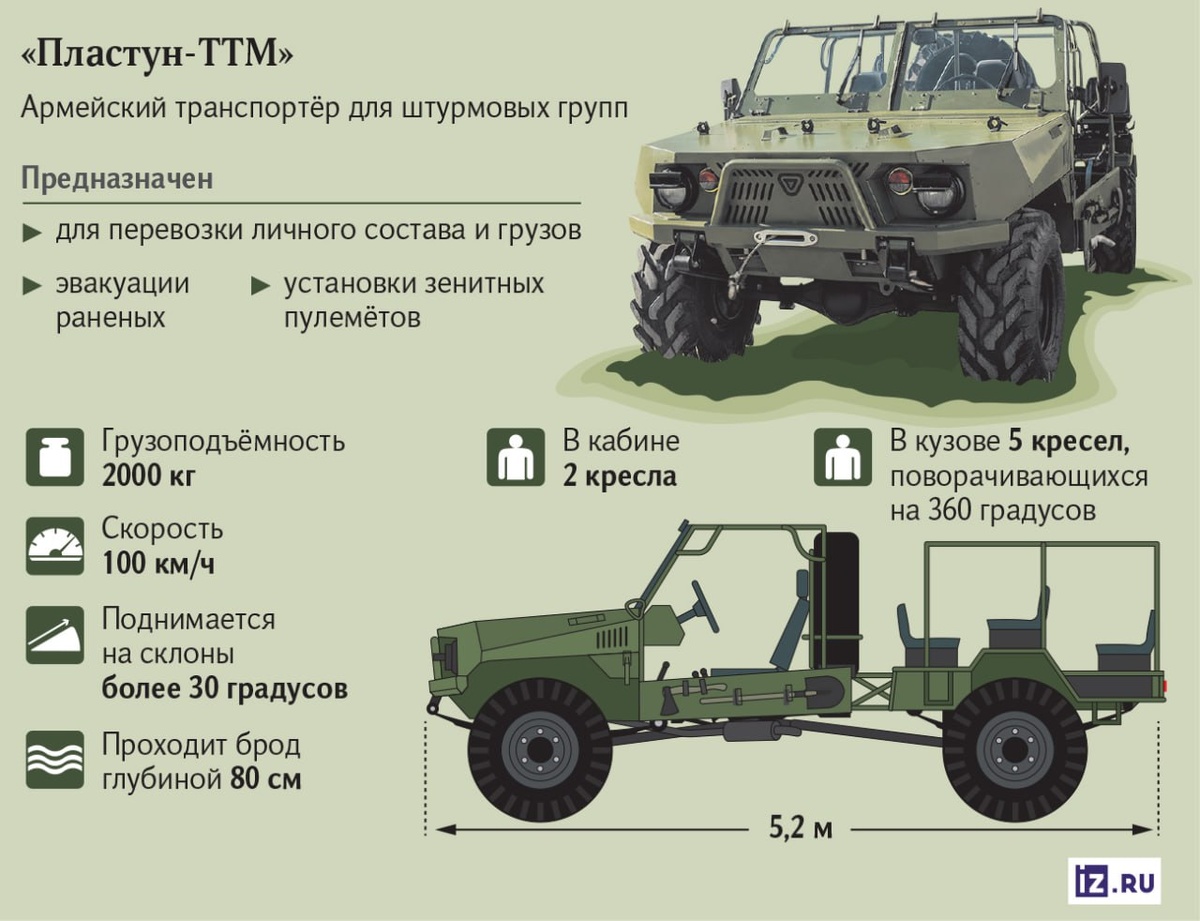 Гендиректор компании «Русские вездеходы Пластун» Ерик Сагымбаев рассказал «Известиям» об основных модификациях нового транспортёра «Пластун-ТТМ»: — Первая версия — штурмовая. В кабине транспортера размещаются два человека, а в кузове стоят пять кресел, которые поворачиваются на 360°. Это позволит стрелкам вести огонь в любом направлении на ходу, не вставая с места. Мы сейчас патентуем этот вариант машины. При необходимости машину можно обвесить стандартными штурмовыми бронеэкранами толщиной 6,3 мм. Со снятым каркасом безопасности высота транспортера — всего 1,5 м, что делает его менее заметным. Также габариты машины позволяют перевозить ее военно-транспортными вертолетами Ми-8. Вторая модификация — эвакуационная. Длина кузова задней секции — около 2 м, что позволяет без проблем разместить в нем пару медицинских носилок с надежной фиксацией для транспортировки раненых. Между ними оборудовано рабочее место медика. Третья версия — с ровной платформой, предназначенной для перевозки груз