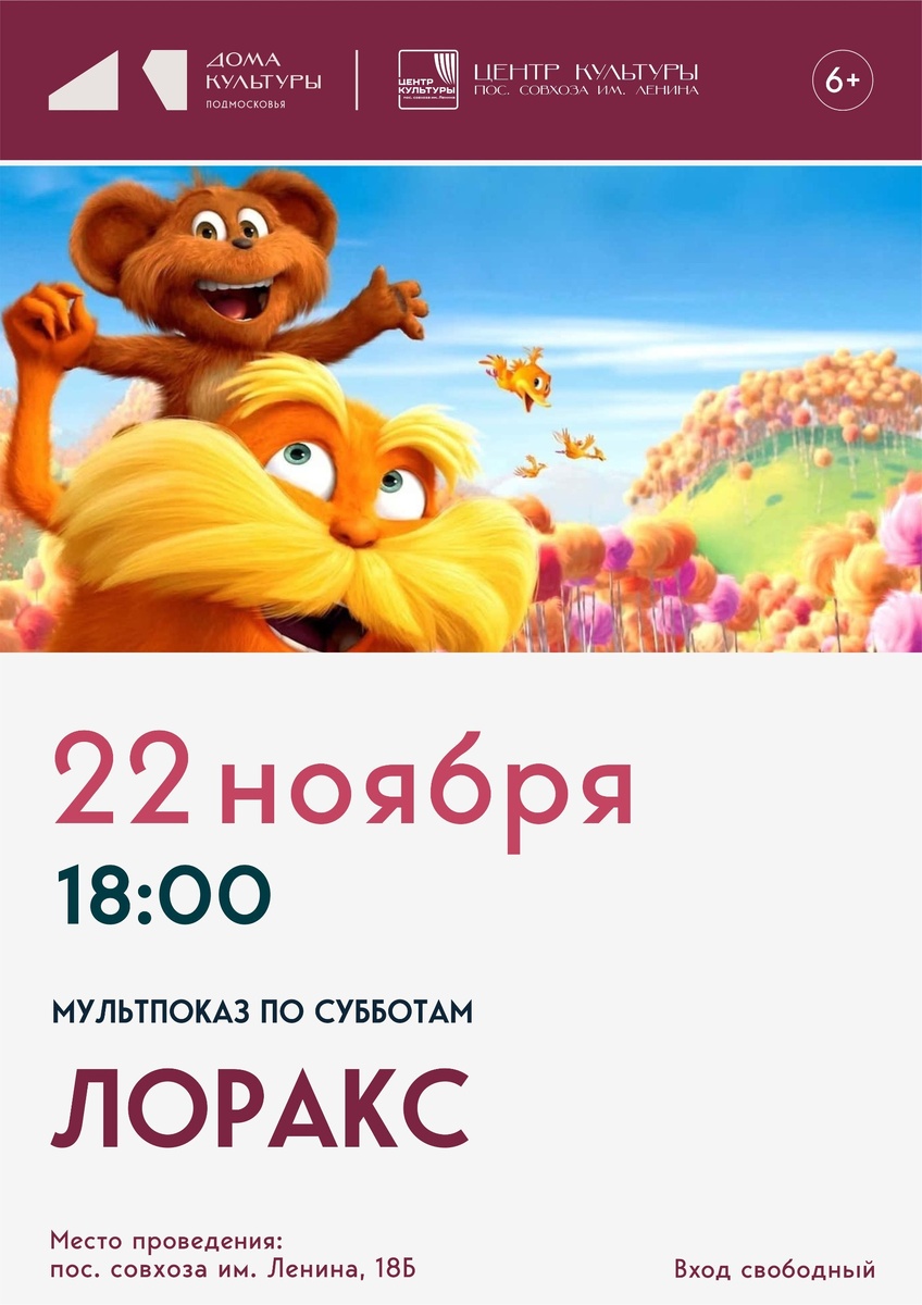 Улыбнись и приходи на Мультвечер!🥰 Мультфильм «ЛОРАКС» 🤩О мультфильме: Недалекое будущее. Стоит нажать на кнопку – и мир изменится по твоему желанию: прямо под окном вырастут горы, во дворе зашумит океан. Единственная неприятность – все вокруг сделано из пластика. Но для влюбленного нет преград. Одно желание прекрасной девушки – увидеть последнее живое дерево – и он пускается в путь. 22 ноября в 18:00 Здание 18 Б, 1 этаж, Малый зал Ждем всех провести время в хорошей компании и отличным настроением! ‼️Вся информация по полочкам – в Telegram-боте Центра культуры https://clck.ru/3Pj7r6 – заходи! #культура #центркультуры #совхозленина #ГоспабликиМО