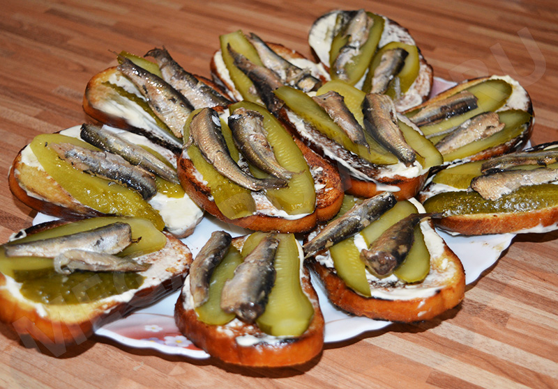 8. Разместите на бутербродах по 2-3 шпротины и 2-3 кружочка огурца.