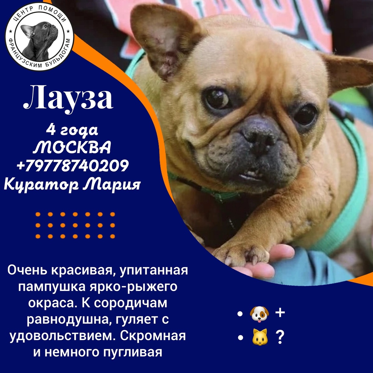 Вот всем говорим !!! Прекрасная собака , прекрасная . Характер - чистый изумруд ! Нежная, ласковая , мирная , веселая ... Чего не так-то ? Кошки, собаки , дети - великолепно ! Ну головушка не поднимается , так ведь это не трагедия? #Лауза@frenchbull_help https://vk.com/topic-144285450_53759088 Ищет дом и никак не найдет ... +79778740209