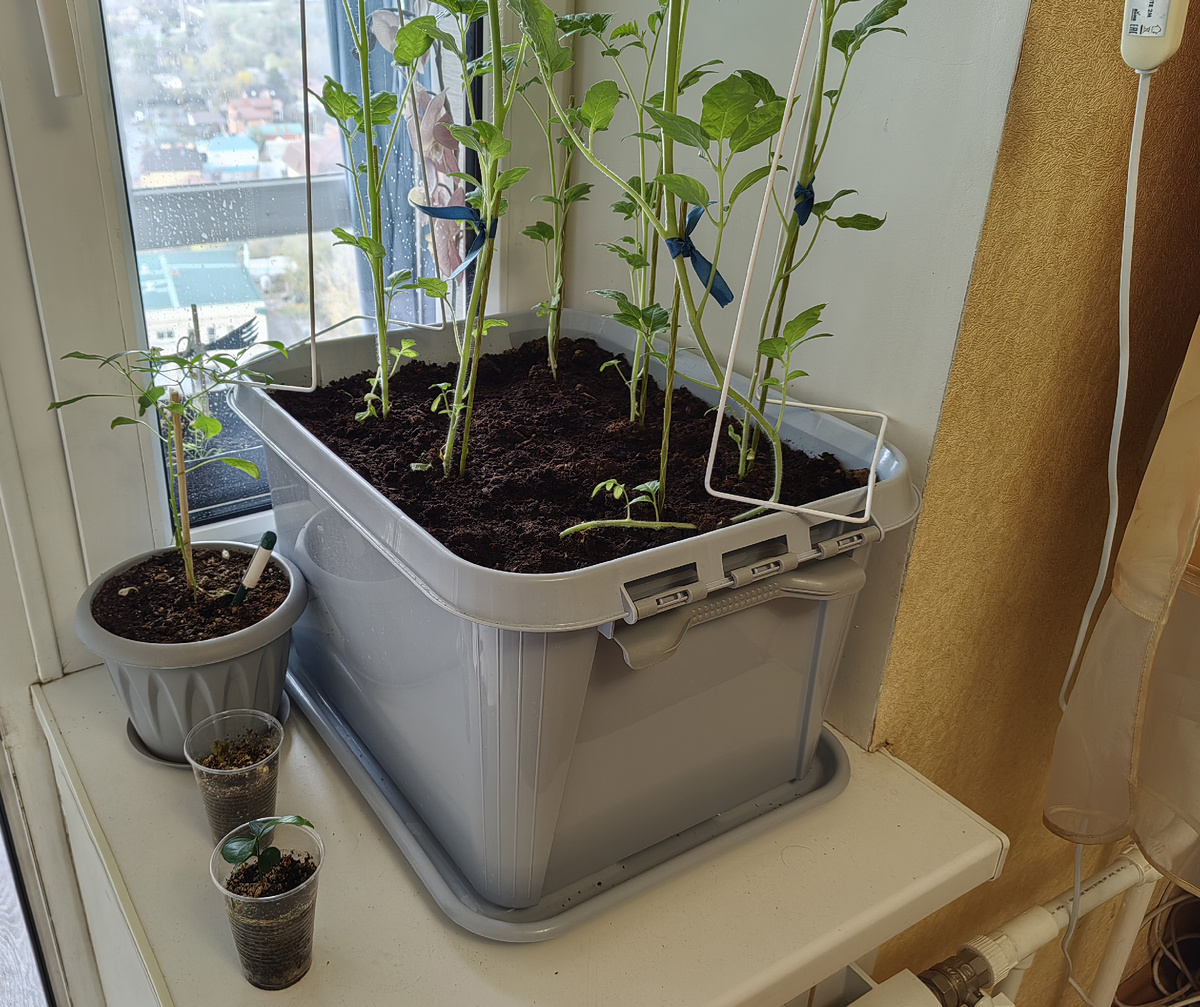 Когда оборудовали этот большой горшок, все получилось отлично. Только недоработали крепления фито-лампы. Оставили временно на кое-как закрепленных стандартных. Но вот помидорки уже обнимают лампу и надо ее как-то поднимать. Стены сверлить под кронштейны не вариант, есть тому причины. Вывод один: нужна более высокая опора. А тут еще и близость балконной двери, откуда дуют сквозняки заставила задуматься о какой-то перегородке.