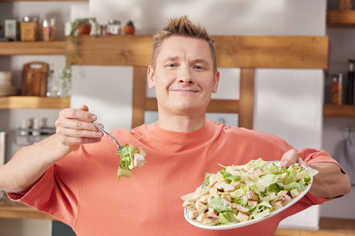 Ингредиенты: Куриные кубики 200 г Батон пшеничный 1/2 шт. Салат ромэн 200 г Помидоры черри 100 г Сыр пармезан 50 г Йогурт греческий густой 140 г Зернистая горчица 2 ч. л. Чеснок 1,5 зубчика Мёд жидкий 1 ч. л. Бальзамический уксус 1 ст. л. Рыбный соус 1 ч. л. Подсолнечное масло 20 мл Соль, перец Приготовление: 1. Нарезать батон кубиками и подсушить на сухой сковороде со всех сторон. 2. На вторую разогретую сковороду налить подсолнечное масло (20 мл) и обжарить куриные кубики до коллера, а в конце поперчить и посолить. 3. Салат нарезать на крупные куски, черри пополам и отправить в большую миску. 4. Заправка: смешать йогурт, горчицу, мёд, измельчённый чеснок и рыбный соус. 5. Перелить заправку к салату и помидорам и забросить гренки, перемешать. Сервировка: 6. Переложить салат на большую плоскую сервировочную тарелку. 7. На салат выложить обжаренные куриные кубики и украсить тонкими слайсами пармезана, нарезанные с помощью экономки. Приятного аппетита! Смотри новый выпуск кулинарного ш