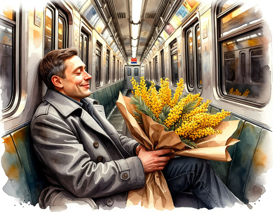 Я сижу и смотрю на этого незнакомого мужчину с улыбкой на лице, со следом от браслета на запястье и букетом мимозы на коленях — и вдруг понимаю, что мне очень хочется узнать его историю.