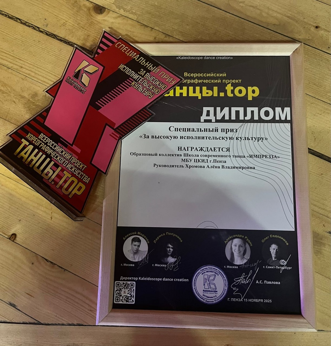 🎉 Школа современного танца "Импрезза" Центра культуры и досуга собрала букет наград на Всероссийском хореографическом проекте Во Всероссийском хореографическом проекте "ТАНЦЫ.ТОП" приняли участие коллективы Пензы и Пензенской области, а также коллективы из городов России. Конкурс прошел в Пензе. 📌 ИТОГИ УЧАСТИЯ: 🔥 Коллектив "Импрезза" получил специальный приз - «За высокий уровень исполнительской культуры» ⭐️ 8 кратные Лауреаты I степени за постановки: - «Летать, чтобы жить» - «Бессонница» - «МЁД» - «Хрупкость современности» - «ВпоСледствии или голая правда» - «Роса» - «Тропы без следов» - «Серая клякса» ⭐️ 3 кратные Лауреаты II степени за постановки: - «Царь горы» - «Соло для позвоночника» - «Долина» ✅ 🎉Под руководством Алёны Хромовой, лидера коллектива "Импрезза", современное хореографическое искусство находит широкое признание. Алёна является не только руководителем, но и главным хореографом-постановщиком, чьи работы для "Импреззы" неизменно удостаиваются высших оценок жюр