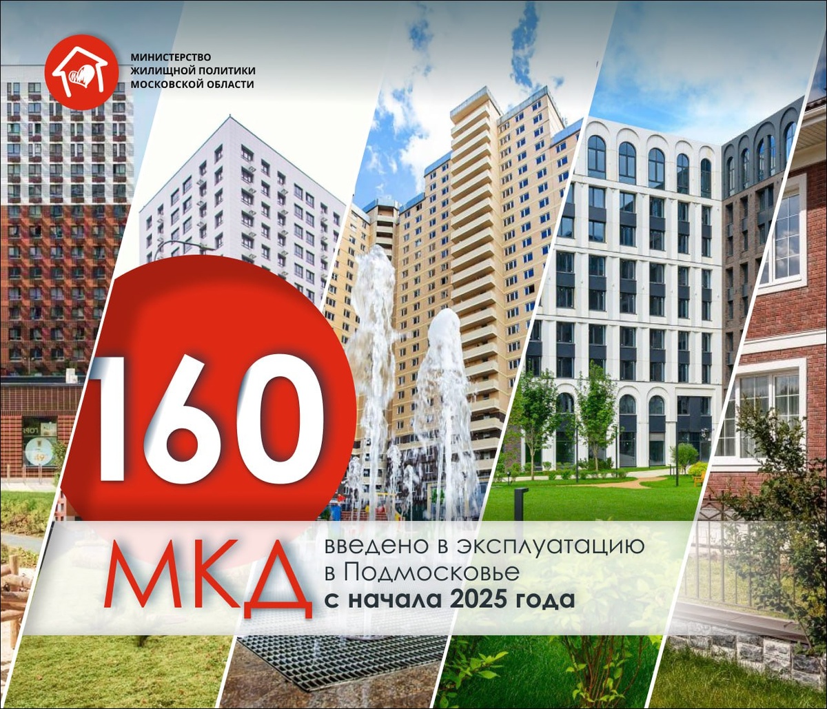 160 новых МКД построено в Подмосковье С начала года в Московской области введено в эксплуатацию 160 многоквартирных домов общей площадью 2,06 млн кв. метров. В сегменте индивидуального жилищного строительства дополнительно введено более 8 млн кв. метров. По совокупному объёму ввода жилья регион демонстрирует самый высокий результат в стране. Наибольшие показатели ввода МКД в городских округах: - Ленинский — 305 тыс. кв. м; - Одинцовский — 236 тыс. кв. м; - Балашиха — 225 тыс. кв. м; - Красногорск — 177 тыс. кв. м; - Домодедово — 162 тыс. кв. м. Среди лидеров по вводу индивидуального жилья: Раменский, Истра и Одинцовский городские округа. @minzhil_mo