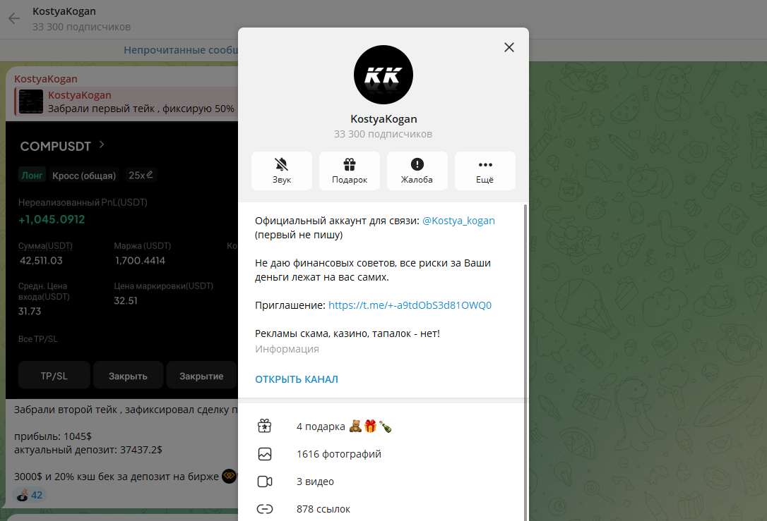 Телеграм-канал KostyaKogan подаётся как место, где «реальный трейдер» показывает свои сделки, делает лесенки и делится сигналами. По словам автора, он умеет разгонять депозит «с пары баксов до тысяч».