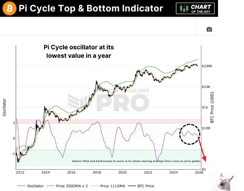 ⚠️ Индикатор Pi Cycle для Bitcoin показывает движение вниз — что это значит для инвесторов? 📉 Технический индикатор Pi Cycle, который использует пересечение скользящих средних для прогнозирования пиков Bitcoin, начал движение вниз. Этот инструмент исторически точно предсказывал значимые максимумы BTC в 2013, 2017 и 2021 годах. Движение индикатора вниз обычно сигнализирует о завершении коррекции или начале нового рыночного цикла. Однако на ноябрь 2025 года полный сигнал пика еще не сработал, и текущий цикл может отличаться от предыдущих. Эксперты отмечают неопределенность в прогнозах, но некоторые аналитики ожидают, что Bitcoin способен превысить уровень около $194 500 в текущем цикле. #новости #БезПафосаФинансы #Bitcoin #криптовалюта #техническийанализ