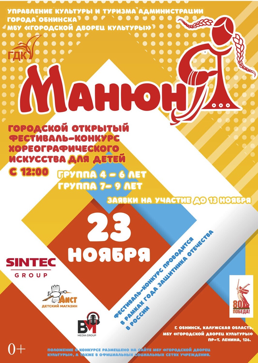 Детский фестиваль-конкурс «Манюня» 23 ноября 23 ноября в ГДК пройдёт III Городской открытый фестиваль-конкурс хореографического искусства «Манюня». Конкурс посвящён Дню матери и приурочен к Году защитника Отечества в России. «Манюня» – настоящий праздник для самых маленьких артистов в возрасте от 4 до 9 лет. Он даёт детям уникальную возможность проявить свои способности, сделать первые шаги на большой сцене и найти новых друзей. В этом году география фестиваля расширилась: в нём участвуют 22 детских хореографических коллектива из Обнинска, Калуги, Малоярославецкого, Жуковского, Боровского, Дзержинского и Кировского районов. Начало в 12:00. Вход свободный. Приходите всей семьей поддержать юных танцоров! #обнинсккультурный