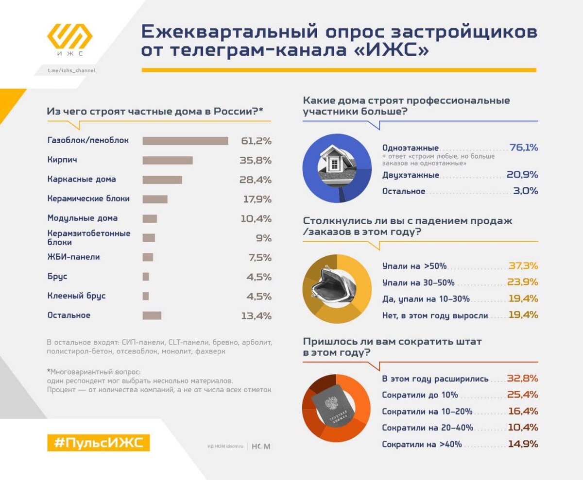 Очень интересная статистика вышла на ИЖС 21% застройщиков могут закрыть свою компанию ⚡️ Не все так хорошо, как говорят нам банки и аналитики. Рубим правду в рубрике #пульсИЖС: мы собрали собственную сводку по компаниям, занимающимся строительством частных домов. Опрос был анонимный, всего 7 обязательных и 1 дополнительный вопрос. Первый — многовариантный вопрос: один респондент мог выбрать несколько материалов. Из чего строят частные дома в России. ▶️ Самый популярный вариант — газо/пеноблок (61,2%), на втором месте — кирпич (35,8%), затем каркасники (28,4%). Отличия от портрета строим.дом.pф (только проекты с их сайта) уже есть. Также в топ-5 вошли керамоблоки с показателем 17,9% и модульные дома (10,4%). Подробнее на слайде. Этажность. ▶️ Одноэтажные (сюда же отнесли вариант «строим любые, но больше заказов на одноэтажные») — 76,1%, двухэтажные — 20,9%, остальное — 3,0% (одно- и двухэтажные, а также вариант «6 и выше» — монолитные дома). Падение заказов и продаж. ▶️ Упали б