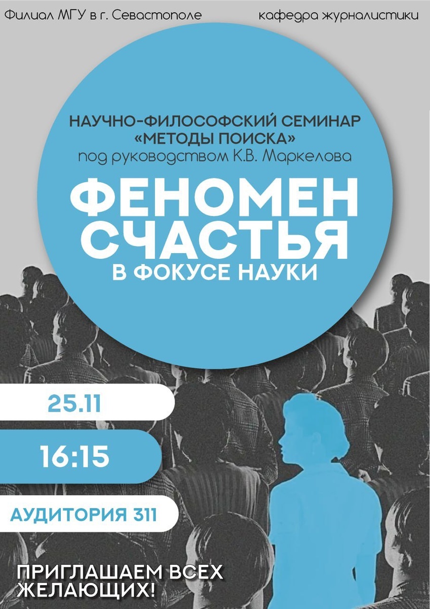 Уважаемые студенты, преподаватели, сотрудники! 🗓 25 ноября 2025 года в Филиале МГУ в г. Севастополе в 311 аудитории учебно-административного корпуса в 16.15 состоится научно-философский семинар "Методы поиска" на тему "Феномен счастья в фокусе науки". 💬С основным докладом "Опыт авторского исследования феномена счастья в регионах России" выступит профессор кафедры журналистики, доктор политических наук Кирилл Вячеславович Маркелов. 🔔 Для дискуссии приглашаются все желающие. #объявления_севмгу