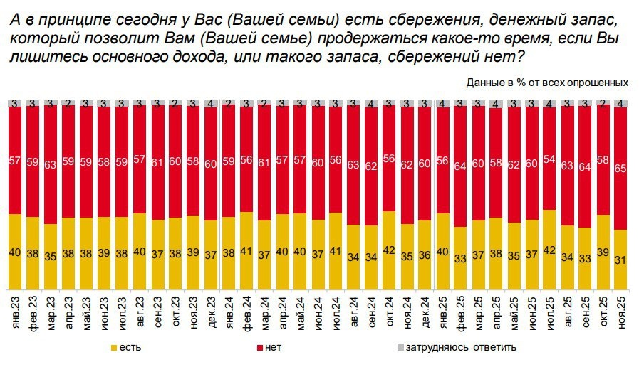 % семей со сбережениями падает https://www.cbr.ru/Collection/Collection/File/59422/inFOM_25-11.pdf Исследование Superjob было более конкретным Среди тех, кто всё же смог сформировать «подушку безопасности», 13% смогут прожить без зарплаты меньше месяца, 24% — от одного до двух месяцев, 12% — от трёх до шести месяцев, 7% — от полугода до года, 6% — более года. 38% - нет сбережений