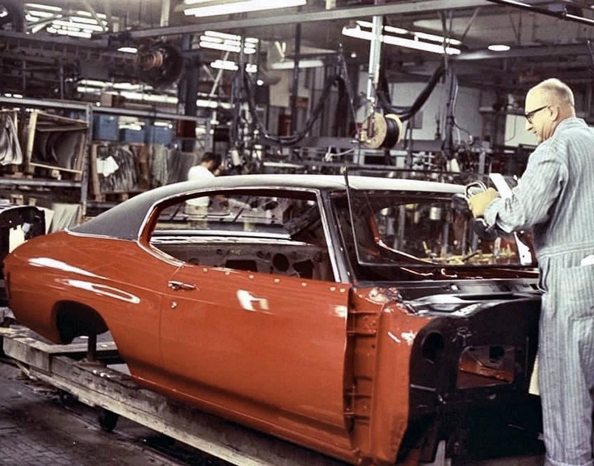 Коллекция уникальных цветных фотографий. Collection of unique color photographs. Рабочий на сборочной линии завода Шевроле, 1970 год. Chevrolet Chevelle assembly line factory man working 1970. Приглашаю посетить и поддержать мой канал на Rutube. Шахматные задачи и красивые партии. I invite you to visit and support my channel on Rutube. Chess puzzles and beautiful games::