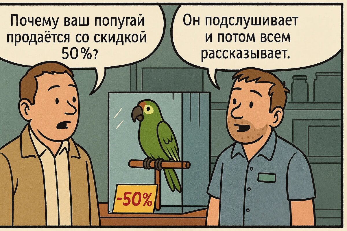 – Вот, она не охраняет, но кричит так, что грабители уйдут сами. *** Покупатель спрашивает у продавца в зоомагазине: – Почему ваш попугай продаётся со скидкой 50%?