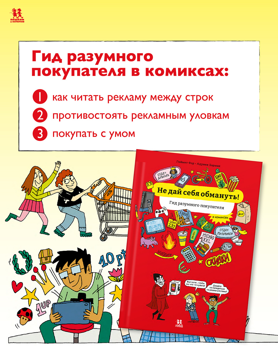 Горький Медиа: "мы живем в обществе потребления, и этот печальный факт наконец проник даже на страницы детской литературы: маленьким читателям и слушателям полезно будет воспитывать в себе критическое отношение к товарному перепроизводству и отвращение к безудержному шопингу". Обзор книги: Гиймет Фор. Не дай себя обмануть. Гид разумного покупателя в комиксах. Иллюстрации Адриен Барман. М.: Пешком в историю, 2025. Перевод с французского Анастасии Шишовой Новинка этого года, целиком и полностью посвященная развенчанию различных маркетинговых трюков, а также аберраций сознания, заставляющих желать еще одну игрушку, когда у тебя их и так уже миллион. Находка для тех родителей, чьи дети склонны к магазинным истерикам в духе Паскалины. Некогда владелец лавочки — убеленный сединой Господин Бонус, чей бизнес прогорел из-за больших магазинов и маркетплейсов, — рассказывает героям историю массового потребления, начавшегося в 1950-е, когда люди бросились покупать вещи «после скудной жизни и огра