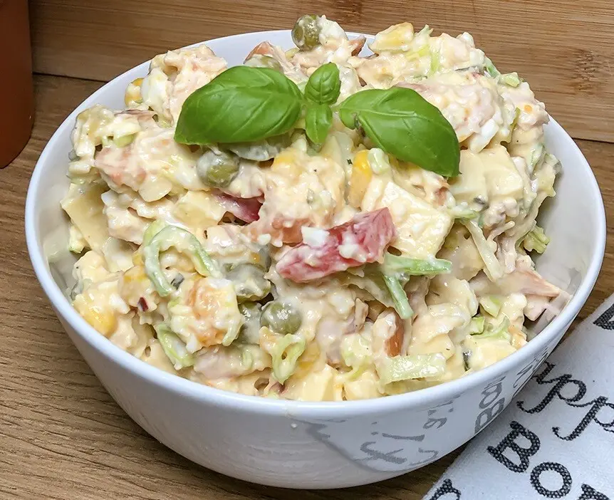 Если вы все еще в поисках того самого салата, то самое время познакомить вас с тремя интересными вариантами. 250 гр. копченого куриного филе кусочками 100 гр. твердого сыра мелким кубиком 2 соленых огурца на терке 1 маленький красный болгарский перец кусочками 1 маленькая банка консервированной кукурузы 1 маленькая банка консервированного горошка или белой фасоли 4 вареных яйца кубиками кусочек стебля сельдерея тонкой соломкой зеленый лук (белая часть) соломкой 3 столовые ложки майонеза 2 столовые ложки натурального йогурта 2 зубчика чеснока соль, перец Все ингредиенты смешать в салатнике, дать постоять полчаса в холодильнике и можно подавать к столу. 300 гр. макарон 600 гр. куриной грудки 0,5 кг винограда банка кукурузы 4 столовые ложки семян подсолнечника майонез (можно пополам с греческим йогуртом или сметаной) соль, перец паприка сушеный чеснок карри масло для жарки мяса Курицу вымойте, обсушите и нарежьте кубиками. Приправьте мясо солью, перцем, сладкой паприкой, сушеным чеснок