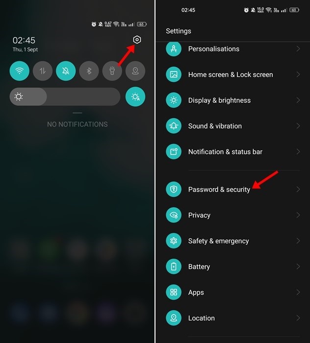 1. Откройте приложение «Настройки» на устройстве Android. Прокрутите вниз и нажмите «Пароли и безопасность» .