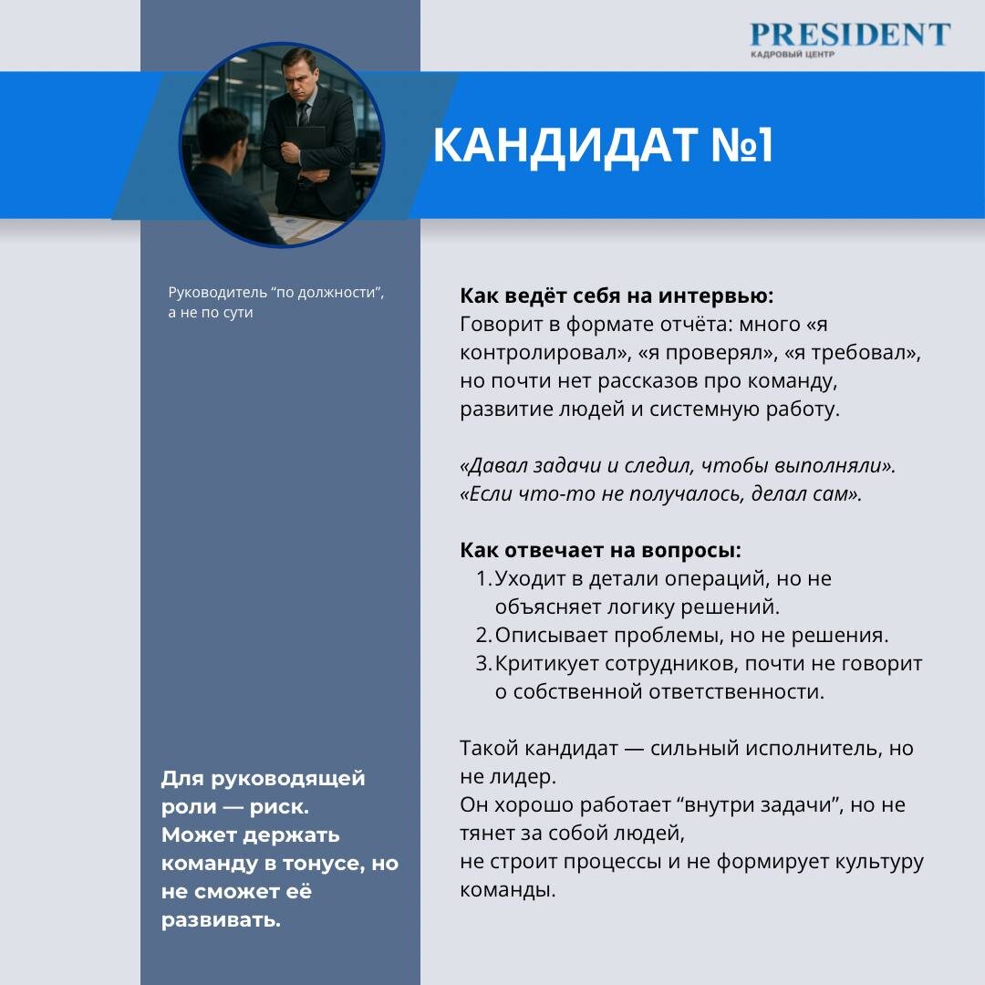 Разбор интервью: Как понять, что кандидат является будущим лидером Иногда всё решается не опытом и не красивыми формулировками в резюме, а тем, как человек ведёт себя на интервью. Мы разобрали два реальных типа кандидатов на руководящие роли: кто из них действительно лидер, а кто только создаёт впечатление. Смотрим разбор на карточках ➡️ #разборинтервью #лидерство #HRинсайты #кадровыйцентрPRESIDENT #PRESIDENT