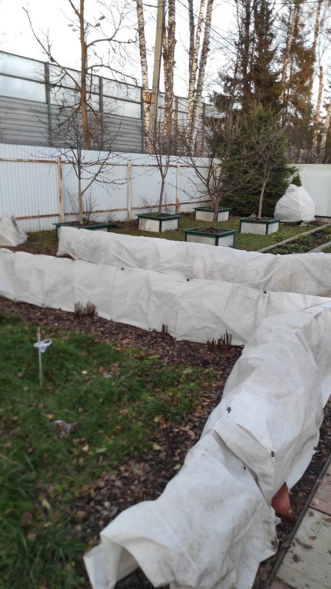 Здравствуйте, мои хорошие 🤗 Крупно повезло вчера с погодой 🤩 Смогли при небольшом потеплении на солнышке укрыть все розы! Большое дело! На мои плетистые я придумала между ветвями и дугами проложить картон! Чтоб он и с железом контакт не давал и спанбонд защищает от шипов и колючек! На ветви кустовых роз одела стаканчики - это защита спанбонда от прорывания. Вдруг много много снега навалит. Был такой год. Пришлось весь укрывной потом менять.😔 Сначала разложила ватные диски с дёгтем . Тут я намучилась 😏 Новая бутылка 500 мл, а он густой как масло сливочное, никак не вытекает. Очень много времени потратила на это. Раньше раз раз и бегом.Вообщем не понравился этот производитель!