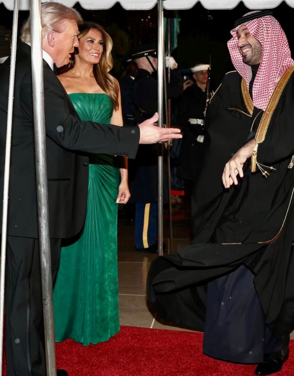 В Белом Доме прошёл торжественный ужин в честь наследного принца Саудовской Аравии Мухаммёда бин Салмана, который прибыл в США с государственным визитом. Его с радушием принимали президент США Дональд Трамп и его супруга Мелания Трамп. Первая леди ослепила своим видом всех присутствующих. Для званого вечера она выбрала платье от ливанского дизайнера Эли Сааб. Оттенок платья Мелании 'Transformative Teal' или 'Преображающийся бирюзовый' , назван главным в 2026 году. Это слияние тёмно-синего и зелёного цветов, считается, что это цвет стабильности, спокойствия и гармонии. Платье с драпировкой от лифа до глубокого выреза, на статной фигуре Мелании платье смотрится очень эффектно! В тон ему были выбраны туфли на высоком каблуке. По фактуре ткань платья напоминает тонкую хорошо выделанную кожу, при этом очень мягко ложаться складки от драпировки. Хочется вспомнить великолепный образ Мелании на ужине в Виндзорском замке. Дональд Трамп со своей супругой находились с визитом в Великобритани