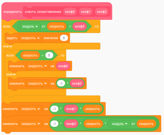 Переименуйте блок "пересчитать скорость", дайте ему название "пересчитать скорость и учесть сопротивление". Доработайте скрипт.
