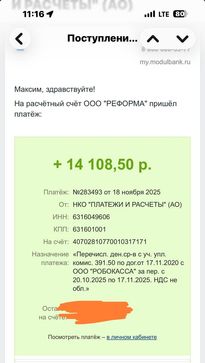 Вот так Робокасса раз в неделю присылает накопленные деньги на счет вашего юр
