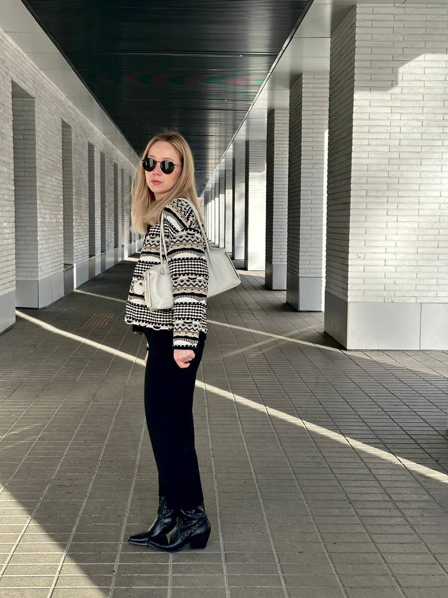 Мой самый первый опыт работы с вязаным трикотажем. Падкая я на красивую ткань и тут устоять не смогла. Ткань из магазина @lo_scampolo_spb. Все ткани — это стоки известных итальянских фабрик и брендов высокого качества: можно найти качественную пальтовую с натуральным составом из шерсти или кашемира, трикотаж, костюмные ткани и твиды, интересные смесовые ткани. #готовыеработы_фешн_хурма ____ Кстати, о геометрии. Мне кажется, у меня отлично получилось совместить рисунок на полочках и рукавах. С боковыми швами было сложнее: волны на ткани живут по своим правилам, и как ни старайся, полностью подчинить их невозможно. Работать с тканью оказалось удивительно приятно. Сразу после кроя я обработала все срезы на оверлоке — чтобы ничего не осыпалось. И всё! Сам жакет я собрала за один вечер. Самой интересной задачей стала обработка краёв. Можно было выбрать простой путь: подогнуть низ и сделать обтачку из той же ткани. Но мне захотелось добавить графики — подчеркнуть край чёрным контуром, как