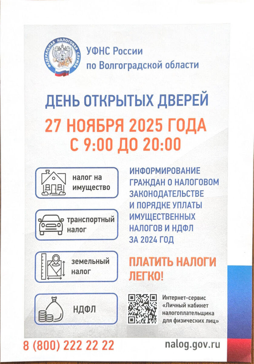 Уважаемые жители Урюпинска!📌 27 ноября 2025 года Управление Федеральной налоговой службы по Волгоградской области проводит День открытых дверей с 9:00 до 20:00.📌 В рамках мероприятия вы сможете получить информацию о налоговом законодательстве и порядке уплаты имущественных налогов и НДФЛ за 2024 год. Особое внимание будет уделено вопросам уплаты налога на имущество, транспортного и земельного налогов, а также НДФЛ. Смотрите афиши ℹ️ Воспользуйтесь интернет-сервисом «Личный кабинет налогоплательщика для физических лиц» для удобной уплаты налогов.📲👥 Платите налоги легко! Контакт-центр ФНС России: 8 (800) 222 22 22, сайт: nalog.gov.ru. 📲 Начните новый год без налоговых долгов!