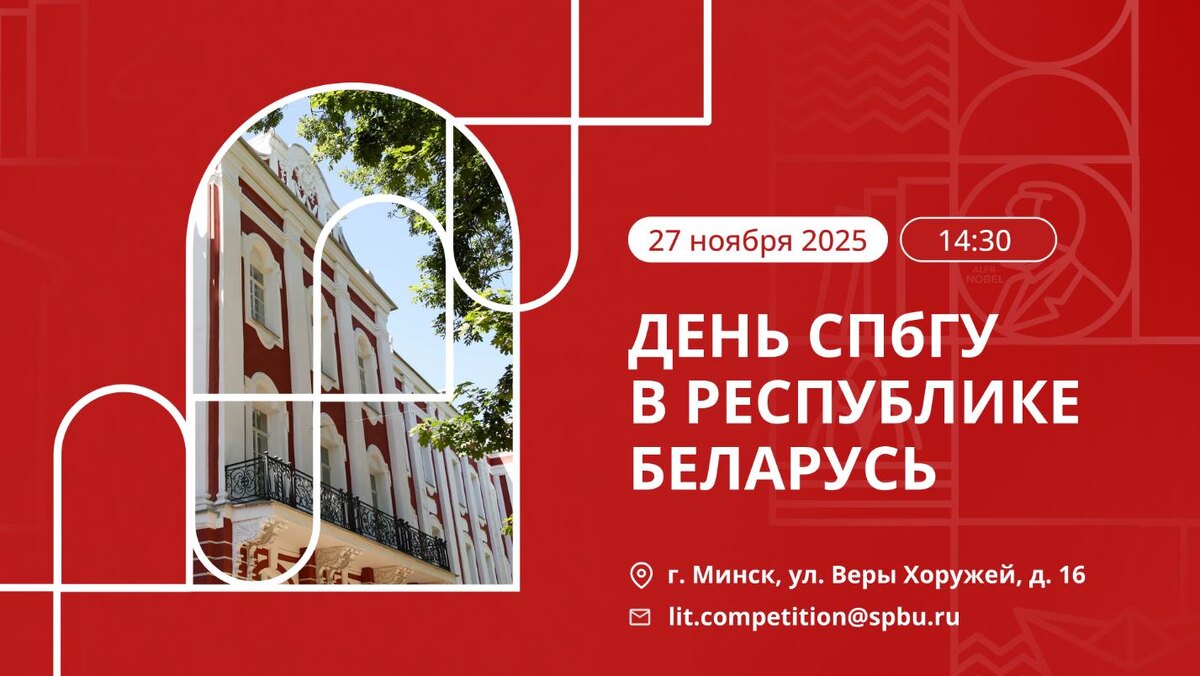 27 ноября в 14:30 в Центральной библиотеке имени Янки Купалы города Минска пройдет День СПбГУ в Республике Беларусь — масштабное мероприятие, направленное на развитие образовательного и культурного сотрудничества между двумя странами. Центральной частью мероприятия станет церемония открытия V сезона международного конкурса научно-исследовательских работ «Литературные судьбы Беларуси и России: от диалога к пониманию», который ежегодно проводится Санкт-Петербургским государственным университетом при поддержке представительства Россотрудничества в Республике Беларусь. Участники церемонии узнают о правилах проведения международного литературного конкурса, предложенных в рамках нового сезона темах научно-исследовательских работ, сроках подачи заявок и этапах проведения конкурса, а также о преимуществах для победителей и призеров при поступлении в СПбГУ. Завершающей частью мероприятия станет презентация Университета, в ходе которой будущие абитуриенты подробнее узнают о научно-образователь