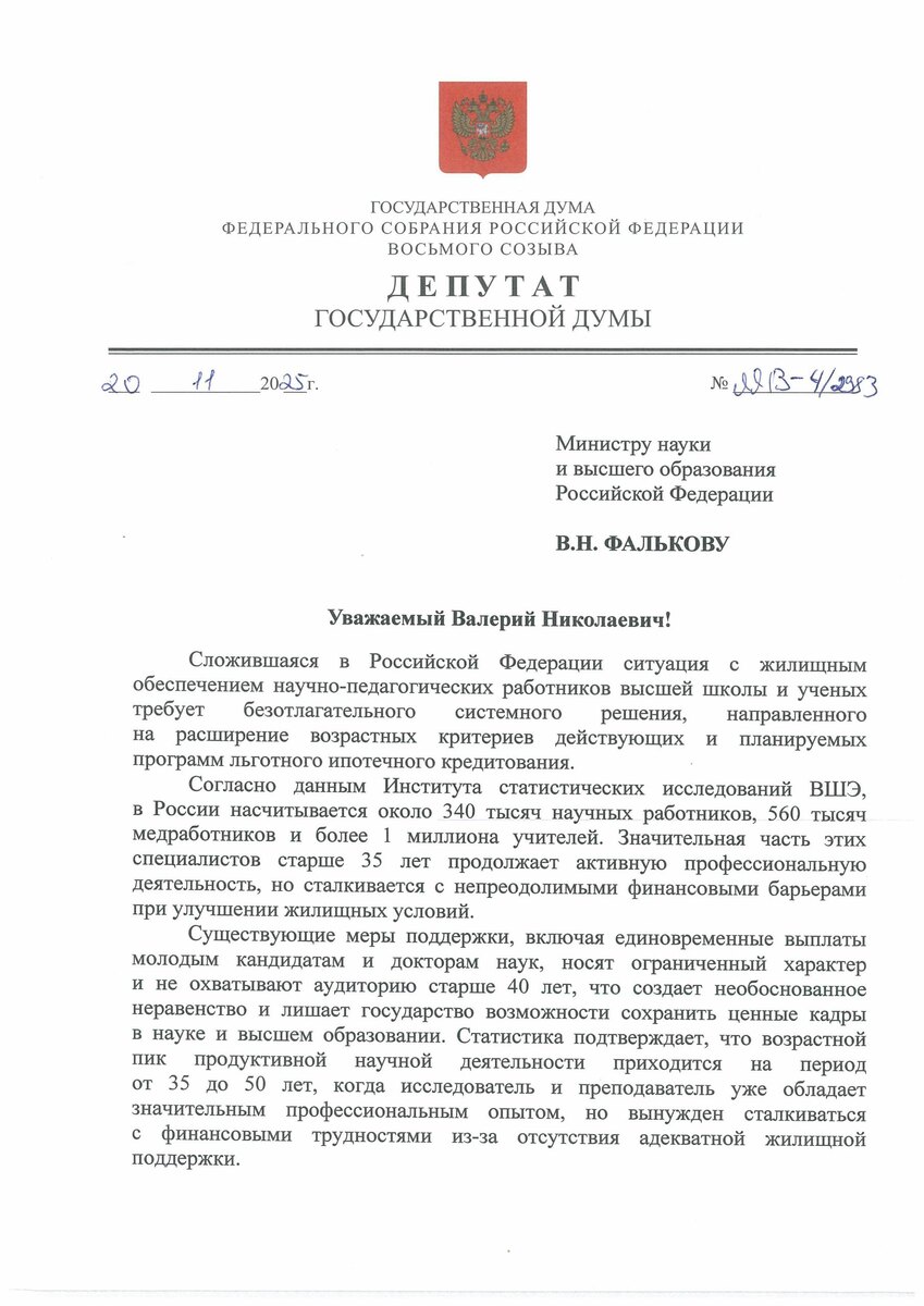 📑Совместно с лидером фракции «Справедливая Россия» Сергеем Мироновым направили обращение министру науки и высшего образования Валерию Фалькову с инициативой о расширении жилищной поддержки для учёных и преподавателей вузов. Сегодня в России около 340 тысяч научных работников и более 1 миллиона учителей. Их труд — основа технологического суверенитета и будущего страны. Но значительная часть из них — опытные специалисты старше 35–40 лет — сталкивается с непреодолимыми барьерами при попытке улучшить жилищные условия. ⚡️Действующие программы льготного ипотечного кредитования ограничены возрастным цензом — чаще всего до 35 или 40 лет. При этом пик научной продуктивности приходится как раз на 35–50 лет. Получается парадокс: человек достигает профессионального расцвета, но не может позволить себе достойное жилье. Такое положение создает неравенство и ставит под угрозу удержание ценных кадров в науке и образовании. 💭Мы предлагаем расширить возрастной порог для участия в программе льготно