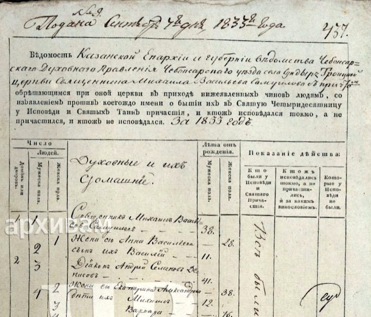 1833 год. Село Сундырь. Чебоксарский уезд. Коротков Козьма Захарович.