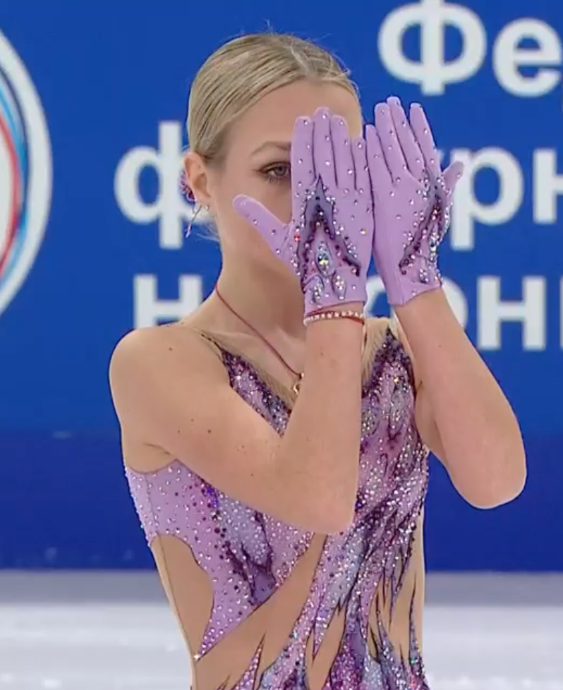 Неожиданно. Хотя учитывая всю подноготную, весь подготовительный процесс, сложности с перелетом из Москвы в Омск, скомканность тренировок, не мудрено, что Елена Костылева по сути проиграла свой этап, где была безусловной фавориткой. Я сейчас абсолютно не злорадствую. Дело ведь еще в том, что у Лены есть травма, о чем нам сообщила ее мама Ирина Костылева: «Ничего не накатывали, у Лены травма. Она катается не больше часа в день, щадящий режим. У нее травма уже три недели. Прошлый старт она катала с травмой. Травма – это не секрет, Евгений Викторович говорил об этом. Травма обычного спортивного характера, как у всех. Так как Лена вышла в сезон в сентябре, все начинает отваливаться постепенно – голеностоп, пах, колено. Сейчас колено. Пах прошел, но заболело колено». Может именно травмой объясняются во-первых, такие долгие заходы на прыжки (особенно на триксель), а во-вторых, уж очень явная собранность при исполнении четверных. Сегодняший прокат был тяжелым: на каждый элемент Лена шла к