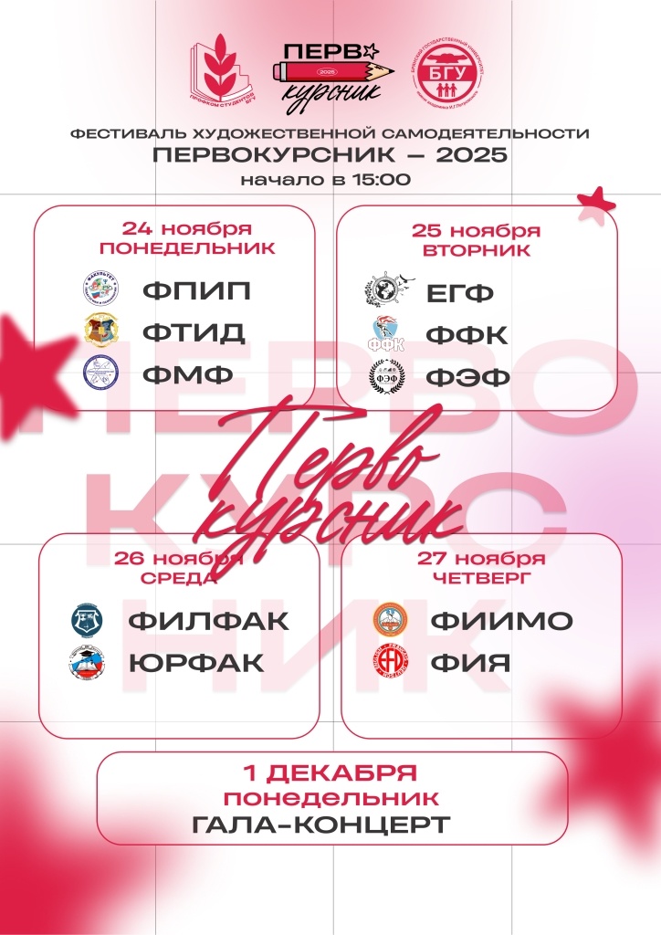 С 24 по 27 ноября в университете состоится самое масштабное студенческое событие осени – фестиваль художественной самодеятельности «Первокурсник-2025». Фестиваль призван способствовать повышению культурного уровня студенческих коллективов, укреплению дружеских связей между факультетами, организации досуга обучающихся. В течение четырех конкурсных дней фестиваля на сцену актового зала поднимутся более 300 студентов-первокурсников всех факультетов университета. Традиционно на суд компетентного жюри и зрительного зала будут представлены интересные сценарные постановки и разножанровые номера в вокальном, танцевальном, театральном направлениях. На гала-концерте, который пройдет 1 декабря, станут известны имена всех лауреатов фестиваля. Данный фестиваль дарит первокурсникам уникальную возможность блеснуть талантами и заявить о себе, это их первый шаг на пути к многочисленным творческим победам. Желаем дебютантам вдохновения и удачи, а зрителям – приятных эмоций от просмотра творческих прогр