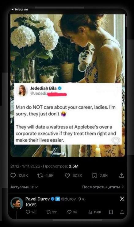 👀 Каких девушек предпочитает Павел Дуров? Глава Telegram Павел Дуров выразил полное согласие по поводу того, что мужчинам не интересна карьера женщины. Это следует из его ответа на запись пользовательницы сети X, которая сделала перепост следующего содержания: «Мужчин не заботит ваша карьера, дамы. Извините, это так. Лучше они будут встречаться с официанткой из Applebee, чем с корпоративным директором, если она обращается с ними хорошо и делает общую жизнь лучше» Что думаете? 🔥 — Круто! 🤔 — Ну такое... #Дуров Подписаться. UCN про Telegram