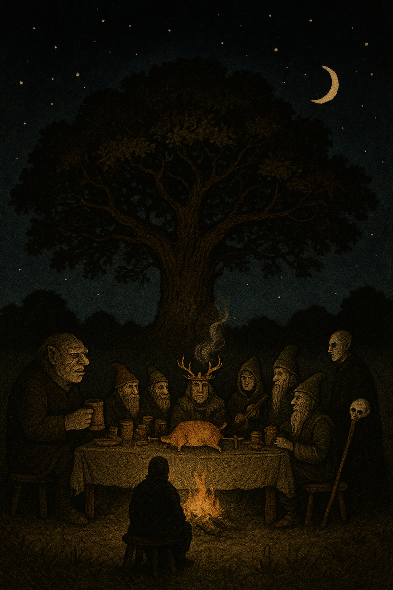 Дуб был старше всех королевств, что когда-либо стояли на этой земле. Его корни уходили так глубоко, что, говорят, касались самого дна преисподней, а крона задевала нижний край небес, где ангелы прячут свои крылья от дождя. Раз в год, в ночь на Ивана Купалу, когда время замирает между двух вздохов мира, под этим дубом собирались те, кого люди давно вычеркнули из молитв и сказок.