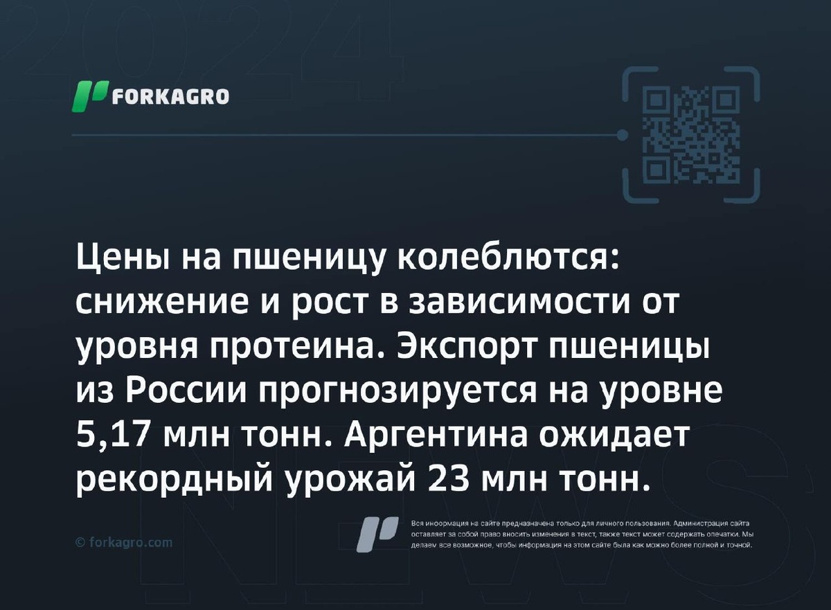Цены на пшеницу колеблются: снижение и рост в зависимости от уровня протеина. Экспорт пшеницы из России прогнозируется на уровне 5,17 млн тонн. Аргентина ожидает рекордный урожай 23 млн тонн. Цены на российскую пшеницу с разным уровнем протеина меняются: снижение до $229-230 за тонну и рост до $227,5 за тонну. Прогноз экспорта пшеницы из России увеличен до 5,17 миллиона тонн. USDA не опубликовала отчёт из-за проблем с финансированием, что вызвало ожидания роста мировых запасов. В Аргентине прогноз урожая пшеницы увеличен. Цены на пшеницу в России остаются стабильными или понижаются. В Сибири цены на пшеницу также стабильны. Перейти к источнику