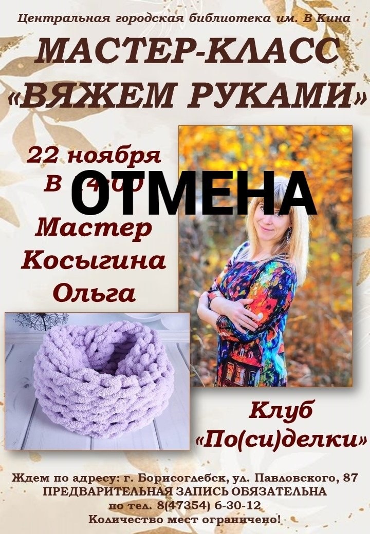 ОТМЕНА МАСТЕР-КЛАССА «ВЯЖЕМ РУКАМИ» Мастер- класс, запланированный на 22 ноября на 14:00 в ЦГБ им. В. Кина, ОТМЕНЯЕТСЯ. Новую дату и время сообщим дополнительно! Телефон для справок 6-30-12.