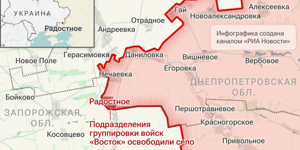 Министерство обороны РФ объявило, что установило контроль над несколькими населёнными пунктами, в том числе над селом Радостное в Днепропетровской области. Ведомство также сообщило о переходе под контроль российских сил населённых пунктов Новосёловка, Ставки, Масляковка и Ямполь на территории Донецкой Народной Республики.
