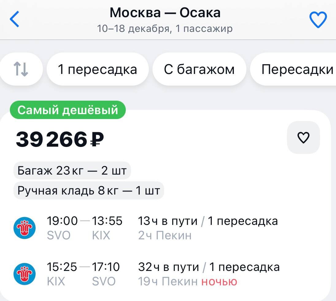 🇯🇵 Москва – Осака (Япония): перелёт от 39 266₽ Рейсы с двумя местами багажа через Пекин Даты: 10–18 декабря Стоимость: от 39 266₽ Включено: багаж 2×23 кг + ручная кладь 8 кг Маршрут: · Вылет из Шереметьево в 19:00, прибытие в Осаку в 13:55 · Обратный вылет из Осаки в 15:25, прибытие в Москву в 17:10 · Пересадка в Пекине: 2 часа (туда), 19 часов (обратно) Для справки: · Посещение Японии требует оформления визы · Транзит через Китай визы не требует · В декабре в Осаке +8...+12°C #Осака #Япония #Авиабилеты #Osaka #Japan #Flights