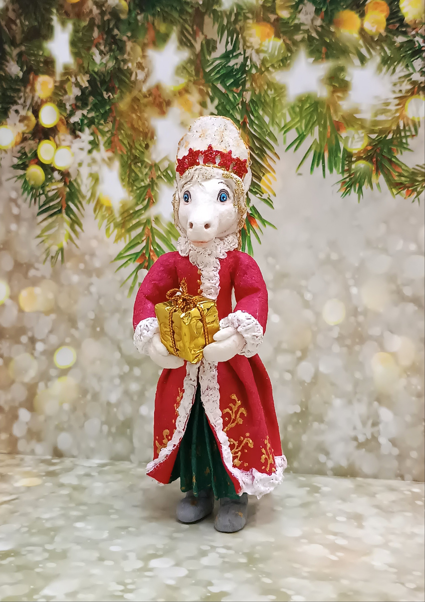 Так уж повелось, что восточный гороскоп нашел большой отклик в наших сердцах при оформлении праздника. Кто-то видит в этом факте личное оскорбление и неуважение к родным славянским традициям. А кто-то просто радуется возможности интересно украсить свой Новый год, не забывая при этом и о традиционных русских обычаях))). Считаю, что это не повод для ломания копий и споров, в сегодняшнем космополитичном мире тесно переплелись культуры и обычаи разных стран, поэтому нет ничего ужасного в ежегодных парадах красивых драконов-петухов-лошадок. А поскольку 2026 год - год Огненной Лошади, то нас ожидает обилие изображений и сувениров на эту тему. Конечно же, и я представлю свою галерею изделий с коняшками))). Первой хочу показать необычную Снегурочку - лошадку в карнавальном костюме. Она не только несет красоту в наступающий год, но и обещает хорошие долгожданные подарки, что символизирует коробочка в ее руках. Наряжена Снегурочка в яркую красную шубку с меховой опушкой и росписью золотым аркил