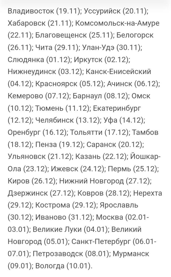Расписание движения поезда Деда Мороза...Попробуйте вписать в это расписание Вязники с остановкой 9 ноября. Проголосуй за канал если у тебя подписка Telegram Premium