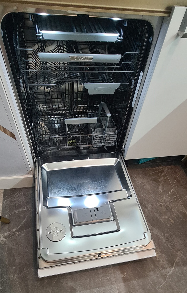 Если у Вас проблема как и у меня , после каждой мойки дверца посудомоечной машины открывается не на проветривание а открывается полностью , а может еще и с небольшим ударом то безусловно это проблему нужно решать , так как это может привезти к поломки механизма и поломке посудомоечной машины в целом , ну и в принципе это не удобно и не безопасно когда большое пространство пола занимает дверца посудомоечной машины . Данную проблему рассмотрим на примере посудомоечной машины ASKO , решить ее крайне просто , все что нам понадобится это шлицевая отвертка . Первым делом нам необходимо снять цоколь вашей кухни , за цоколем мы увидим непосредственно основание посудомоечной машины где слева и справа находятся металлические заглушки-фиксаторы , за которой скрывается регулировочный болт натяжения пружины которая в свою очередь и удерживает дверцу посудомоечной машины при проветривании , ну и в целом помогает нам открывать и закрывать дверцу посудомоечной машины с большей легкостью так как сам