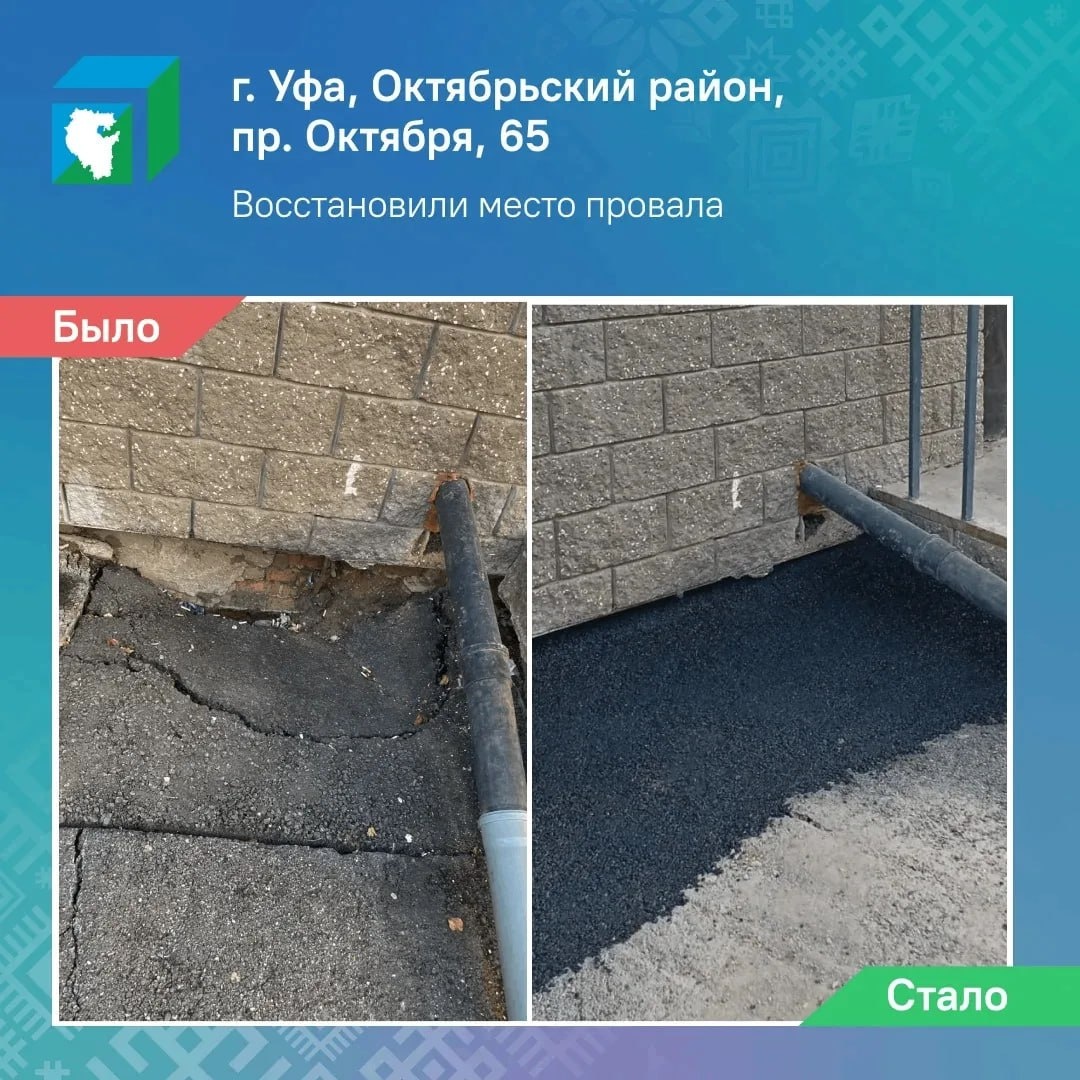 😀😃😄😁 В Уфе на проспекте Октября вдоль фундамента у дома 65 восстановили провал. О его появлении в комментарии в соцсетях написал один из жителей города. Сообщение о проблеме зафиксировала информсистема Центра управления республикой «Инцидент-менеджмент», и администрация Октябрьского района взяла её на контроль. Управляющая компания выполнила необходимые работы – восстановила место провала. 💚 ЦУР Башкортостана