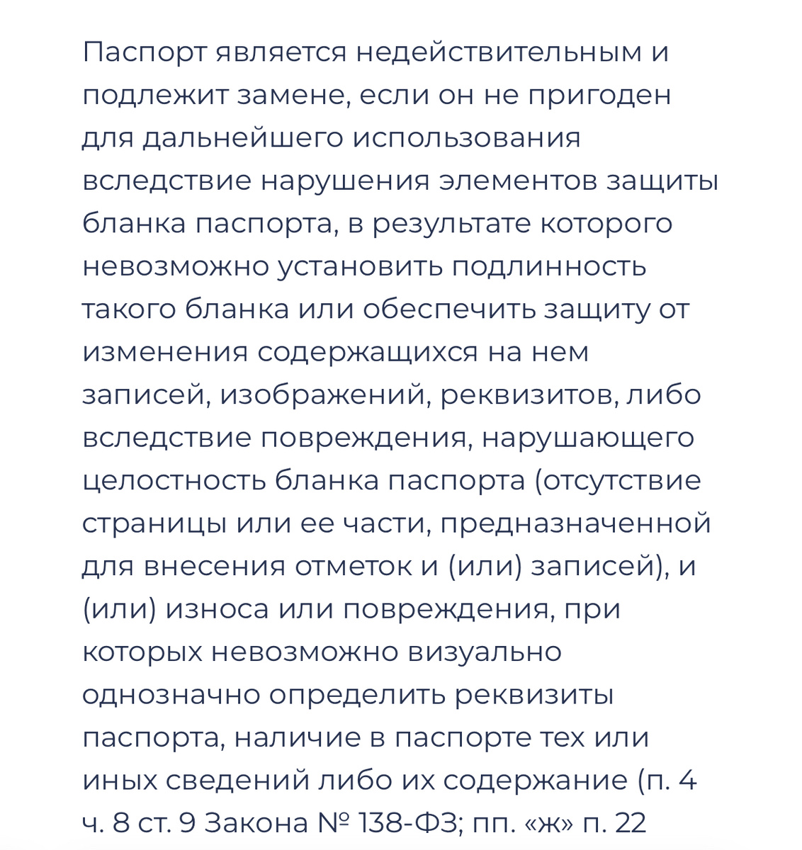 Кстати, обращалась в МВД с этим вопросом , влияет ли этот уголок - там ответили, что главное страницы по которым можно идентифицировать гражданина и страницы с отметками, и чтобы были пустые где ставить визу- данный дефект не является основанием для отказа в визе !!! На таможне также сказали, да паспорт подлежит замене!! Но оснований для изъятия или задержания гражданина на границе нет и по территории России допустимо прохождение границы!!!