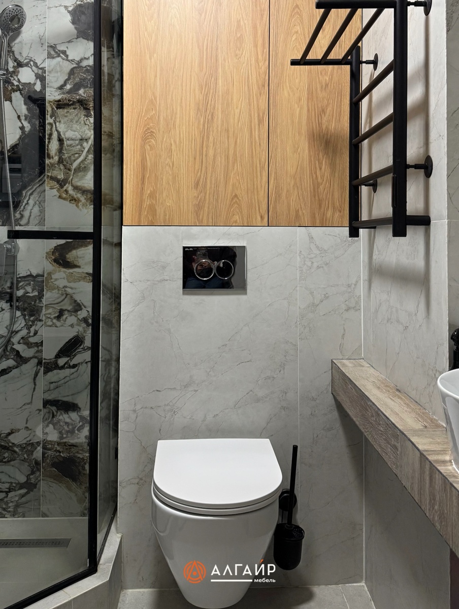 Работа с постоянными клиентами — всегда особенное удовольствие. К нам снова обратился заказчик, который уже доверял нам производство мебели и оставил хороший отзыв 🥰 Пространство небольшое, и главным запросом было разместить технику так, чтобы скрыть весь не нужный шум. Мы создали для него проект санузла, где эргономика, качество и эстетика работают как единый организм 😮💨 ▪️ Мы использовали качественные материалы и фурнитуру, поэтому мебель прослужит долго и сохранит свой внешний вид. ▪️ Каждая деталь работает на удобство: техника объединена в единый модуль, а системы хранения скрыты. ▪️ Тёплая текстура дерева и каменные поверхности создают современный, чистый стиль. 💌 Рассчитать проект по фото!