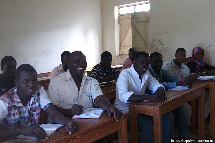 Когда в начальной школе отзвенит последний звонок для детишек, сюда приходят дядьки постарше и записываются на уроки на безвозмездной основе. В Судане более половины населения не умеют писать, поэтому никто не считает зазорным претворять заветы Ильича в жизнь. В основном, записываются на уроки английского, которые преподает все тот же, знакомый по прошлому репортажу учитель со странным для нашего слуха именем Куку ( ударение на последний слог) Насколько я понял, Куку здесь единственный учитель мужеского пола — остальные учителя ходят в юбках. Это придает ему особый статус на территории школы и церкви и его весьма даже уважают.