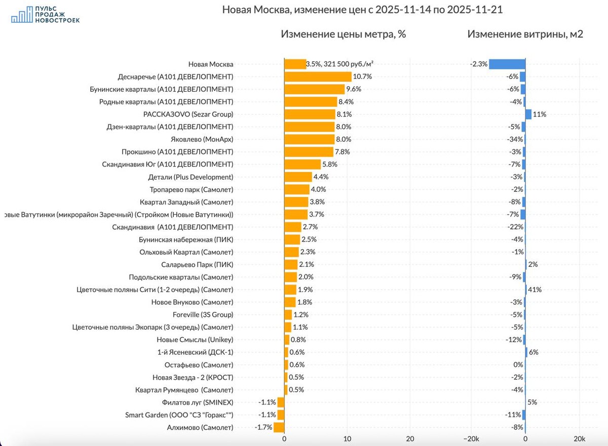 Новая Москва, обзор изменения предложения на рынке за неделю💰 Смотрим без премиум и элит классов. 💵 За 7 дней цена метра выросла на 3.5% до 321 500 рублей за метр. 📈Топ изменения цен (подорожало): 1️⃣ЖК "Деснаречье" (А101 ДЕВЕЛОПМЕНТ) цена метра +10.7%, витрина предложения уменьшилась на -2059м2 2️⃣ЖК "Бунинские кварталы" (А101 ДЕВЕЛОПМЕНТ) цена метра +9.6%, витрина предложения уменьшилась на -1735м2 3️⃣ЖК "Родные кварталы" (А101 ДЕВЕЛОПМЕНТ) цена метра +8.4%, витрина предложения уменьшилась на -722м2 🪫Анти топ (подешевело): 1️⃣ЖК "Алхимово" (Самолет) -1.7% в цене, витрина предложения уменьшилась на -150м2 2️⃣ЖК "Smart Garden" (ООО "СЗ "Горакс"") -1.1% в цене, витрина предложения уменьшилась на -1193м2 3️⃣ЖК "Филатов луг" (SMINEX) -1.1% в цене, объем витрины при этом увеличился на 158м2 ☄️Объем предложения жилья в регионе ниже -2.3% (-13458 м2) Все изменения в регионе на картинке, ставьте 🔥если хотите посмотреть на Санкт-Петербург. ‼️Только для наших подписчиков в телегра