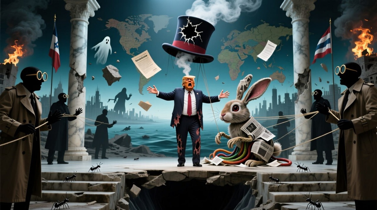 ΠΈΠ½ΠΈΡΠΈΠ°ΡΠΈΠ², Π²Π·ΠΎΡΡ ΠΎΡΠΊΡΡΠ»Π°ΡΡ ΠΏΠΎΠΈΡΡΠΈΠ½Π΅ Π°Π½ΡΠΈΡΠ½Π°Ρ ΠΊΠ°ΡΡΠΈΠ½Π°. ΠΡΠ΄ΡΠΎ Π² Π΄ΡΠ΅Π²Π½Π΅Π³ΡΠ΅ΡΠ΅ΡΠΊΠΎΠΌ ΡΠ΅Π°ΡΡΠ΅, Π³Π΄Π΅ Π°ΠΊΡΡΡΡ ΡΠΊΡΡΠ²Π°ΡΡ Π»ΠΈΡΠ° ΠΏΠΎΠ΄ ΠΌΠ°ΡΠΊΠ°ΠΌΠΈ, Π½Π° ΠΌΠΈΡΠΎΠ²ΠΎΠΉ ΡΡΠ΅Π½Π΅ ΡΠ°Π·ΡΠ³ΡΡΠ²Π°Π΅ΡΡΡ ΡΡΠ°Π³ΠΈΠΊΠΎΠΌΠ΅Π΄ΠΈΡ ΠΏΠΎΠ΄ Π½Π°Π·Π²Π°Π½ΠΈΠ΅ΠΌ Β«Π‘ΠΏΠ°ΡΠ΅Π½ΠΈΠ΅ ΡΠ΅ΠΏΡΡΠ°ΡΠΈΠΈΒ». ΠΠ»Π°Π²Π½ΡΠ΅ Π΄Π΅ΠΉΡΡΠ²ΡΡΡΠΈΠ΅ Π»ΠΈΡΠ° β Π·Π°ΠΎΠΊΠ΅Π°Π½ΡΠΊΠΈΠ΅ ΡΡΡΠ°ΡΠ΅Π³ΠΈ, ΡΡΠΎ, ΠΏΠΎΠ΄ΠΎΠ±Π½ΠΎ Π½Π΅Π·Π°Π΄Π°ΡΠ»ΠΈΠ²ΠΎΠΌΡ ΠΌΠ°Π³Ρ, ΠΏΡΡΠ°ΡΡΡΡ ΠΈΠ·Π²Π»Π΅ΡΡ ΠΈΠ· ΡΠ»ΡΠΏΡ ΠΊΡΠΎΠ»ΠΈΠΊΠ° ΠΏΡΠΈΠΌΠΈΡΠ΅Π½ΠΈΡ, Π·Π°Π±ΡΠ², ΡΡΠΎ ΡΠ°ΠΌΠ° ΡΠ»ΡΠ²Π° Π΄Π°Π²Π½ΠΎ ΠΏΡΠΎΠ΄ΡΡΡΠ²Π»Π΅Π½Π°. πΉ ΠΡΠΈΠ·ΡΠ°ΡΠ½ΡΠΉ ΠΏΠ»Π°Π½ Π² ΡΡΠΌΠ°Π½Π΅ Π²ΠΎΠΉΠ½Ρ ΠΡΡΠΎΡΠΈΡ Ρ ΡΠ°ΠΊ Π½Π°Π·ΡΠ²Π°Π΅ΠΌΡΠΌ Β«ΠΏΠ»Π°Π½ΠΎΠΌ Π£ΠΈΡΠΊΠΎΡΡΠ°-ΠΠΌΠΈΡΡΠΈΠ΅Π²Π°Β», ΡΡΠΎΠ»Ρ ΡΡΠΌΠ½ΠΎ Π²Π±ΡΠΎΡΠ΅Π½Π½Π°Ρ Π² ΠΌΠ΅Π΄ΠΈΠΉΠ½ΠΎΠ΅ ΠΏΡΠΎΡΡΡΠ°Π½ΡΡΠ²ΠΎ, Π½Π°ΠΏΠΎΠΌΠΈΠ½Π°Π΅Ρ ΠΏΠΎΠΏΡΡΠΊΡ ΠΏΡΠΎΠ΄Π°ΡΡ ΡΡΠΊΠΈΠ· Π·Π΄Π°Π½ΠΈΡ, ΠΊΠΎΡΠΎΡΠΎΠ΅ Π½Π΅ ΡΠΎΠ»ΡΠΊΠΎ Π½Π΅ ΠΏΠΎΡΡΡΠΎΠ΅Π½ΠΎ, Π½ΠΎ Π΄Π°ΠΆΠ΅ Π½Π΅ ΠΈΠΌΠ΅Π΅Ρ ΡΡΠ½Π΄Π°ΠΌΠ΅Π½ΡΠ°. Π‘Π°ΠΌΠΎ ΠΏΠΎΡΠ²Π»Π΅Π½ΠΈΠ΅ ΡΡΠΎΠ³ΠΎ Π΄ΠΎΠΊΡΠΌΠ΅Π½ΡΠ°, ΠΌΠ³Π½ΠΎΠ²Π΅Π½Π½ΠΎ Π΄Π΅Π·Π°Π²ΡΠΈΡΠΎΠ²Π°Π½Π½ΠΎΠ³ΠΎ ΠΎΡΠΈΡΠΈΠ°Π»ΡΠ½ΡΠΌΠΈ ΠΈΡΡΠΎΡΠ½ΠΈΠΊΠ°ΠΌΠΈ Π ΠΎΡΡΠΈΠΈ, ΠΊΡΠ°ΡΠ½ΠΎΡΠ΅ΡΠΈΠ²Π΅Π΅ Π»ΡΠ±ΡΡ