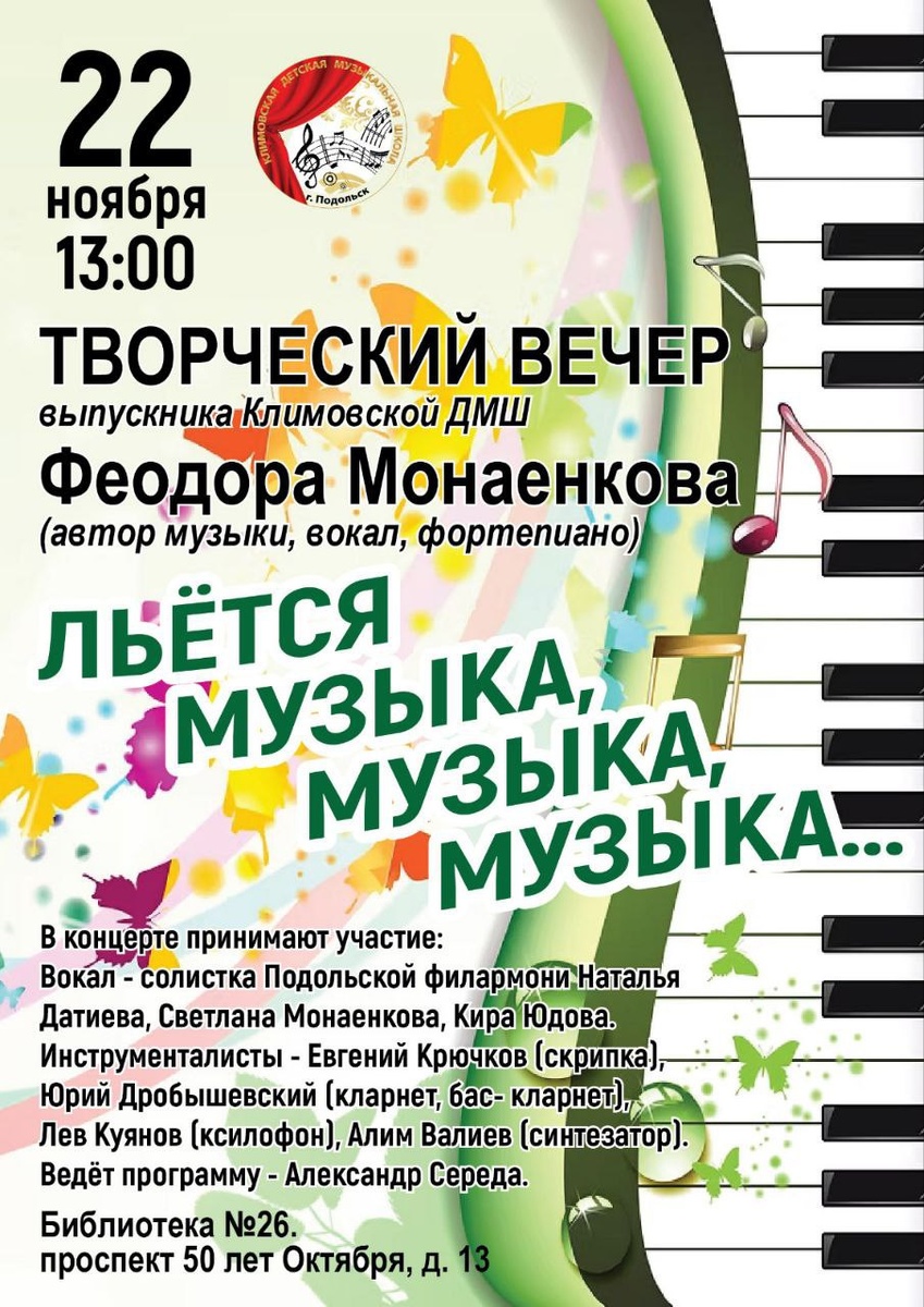 ✨ Творческий вечер выпускника музыкальной школы 🎼🎵 Композитора и исполнителя собственных сочинений Феодора Монаенкова "Льется музыка, музыка, музыка..." 💓В концерте примут участие друзья и коллеги автора. 🚫 Возраст: 0+ 📆 22.11.2025 🕒 13:00 🏢 Библиотека № 26 Климовск 📍 г.о. Подольск, мкр-н Климовск, пр-т 50 лет Октября, 13 💰 Вход свободный❗️ ⭐Поддержать канал голосом 🍰Где поесть в Подольске ✅ Мероприятия Подольск https://dzen.ru/id/66ed500f7b5671493eca3fd6 http://vk.com/podolsk_events http://dzen.ru/podolsk_events