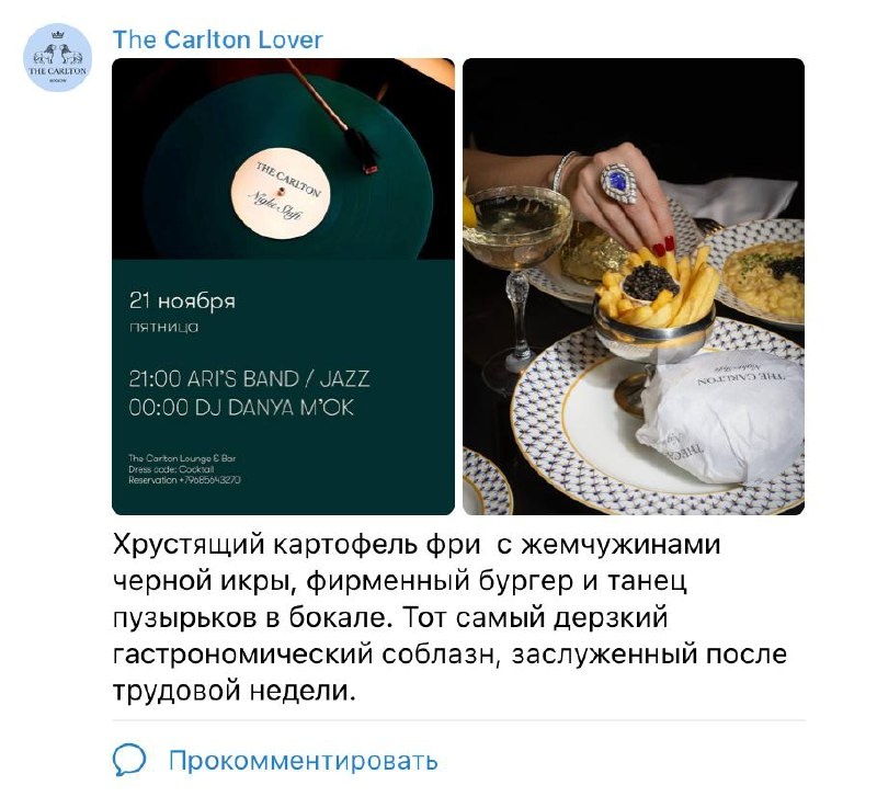 В некоторых постах чувствуется такое рвение «казаться», что аромат чёрной икры начинает перебивать смысл. the Carlton выкатил картофан с икрой, бокал пузырьков и фирменный бургер — всё красиво, вопросов нет. Но подача в канале отеля получилась будто из журнала начала нулевых: много позы, мало истории. Овца Борис смотрит и думает: ну ведь вечер-то хороший обещает быть — джаз, диджей, настроение пятницы. А в посте — только перчатки, кольца и «дерзкие соблазны». Хочется же понимать: зачем приходить, какая атмосфера, что там за бэнд, почему этот вечер — не просто красивый кадр, а план на пятницу. Согласны? #карлтон